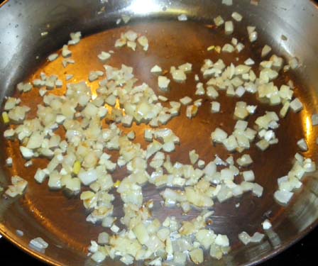 Heat a large pan and add oil, then sweat the onion on medium-high heat until transparent. Add the garlic and cook until golden, immediately add the artichoke hearts, stir, then the spinach. Stir and cover for a minute. Stir again and leave uncovered when the spinach is reduced in size enough to manage by stirring. When spinach is gently cooked, remove from heat and strain.Chop spinach mixture.
