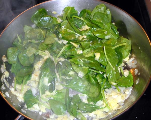 Wash spinach well, if pre-washed just wet. Let drain. The water on the leaves helps to steam the spinach. You can also use frozen once defrosted.